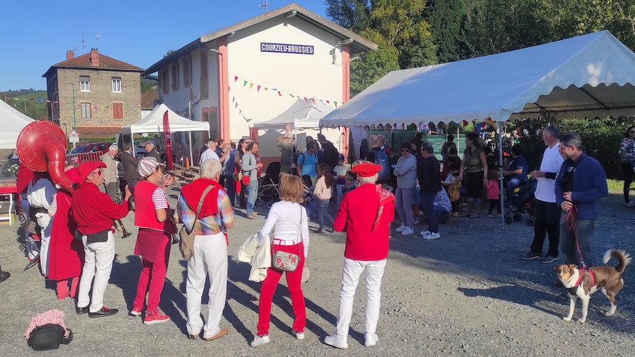 L’ambiance et le désir de prendre un train était bien réel. Des horaires fictifs sur des départs et des arrivées du tram-train, des bruitages de trains et des annonces aux voyageurs pour monter à bord étaient régulièrement diffusés par la sono comme si c’était vrai. Pour l’occasion, le quai central avait été débroussaillé et nettoyé pour accueillir de l’artisanat local et des associations. Les visiteurs pouvaient déambuler dans et autour de la gare pour voir une exposition ou écouter une conférence sur la grande histoire du train dans le Rhône et particulièrement la ligne ferroviaire au départ de Lyon St Paul. Un programme musical rythmait toute la journée avec plusieurs groupes de musique et chanteurs* qui se sont déplacés bénévolement pour soutenir la réouverture de la ligne. Des prises de paroles tout au long de la journée racontaient des anecdotes sur l’histoire des gares de Bessenay et de Courzieu-Brussieu pendant qu’un chef de gare accueillait les visiteurs pour leur distribuer les prochains horaires du tram-train. Cette mise en scène et le plaisir des rencontres de la journée ont-elles sifflés jusqu’aux oreilles des décideurs de la Région comme nous pourrions entendre siffler le train ?
