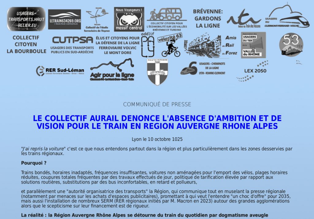 Les 21 organisations du collectif AuRAil dénoncent le manque de vision et d’ambition de la Région, la non prise