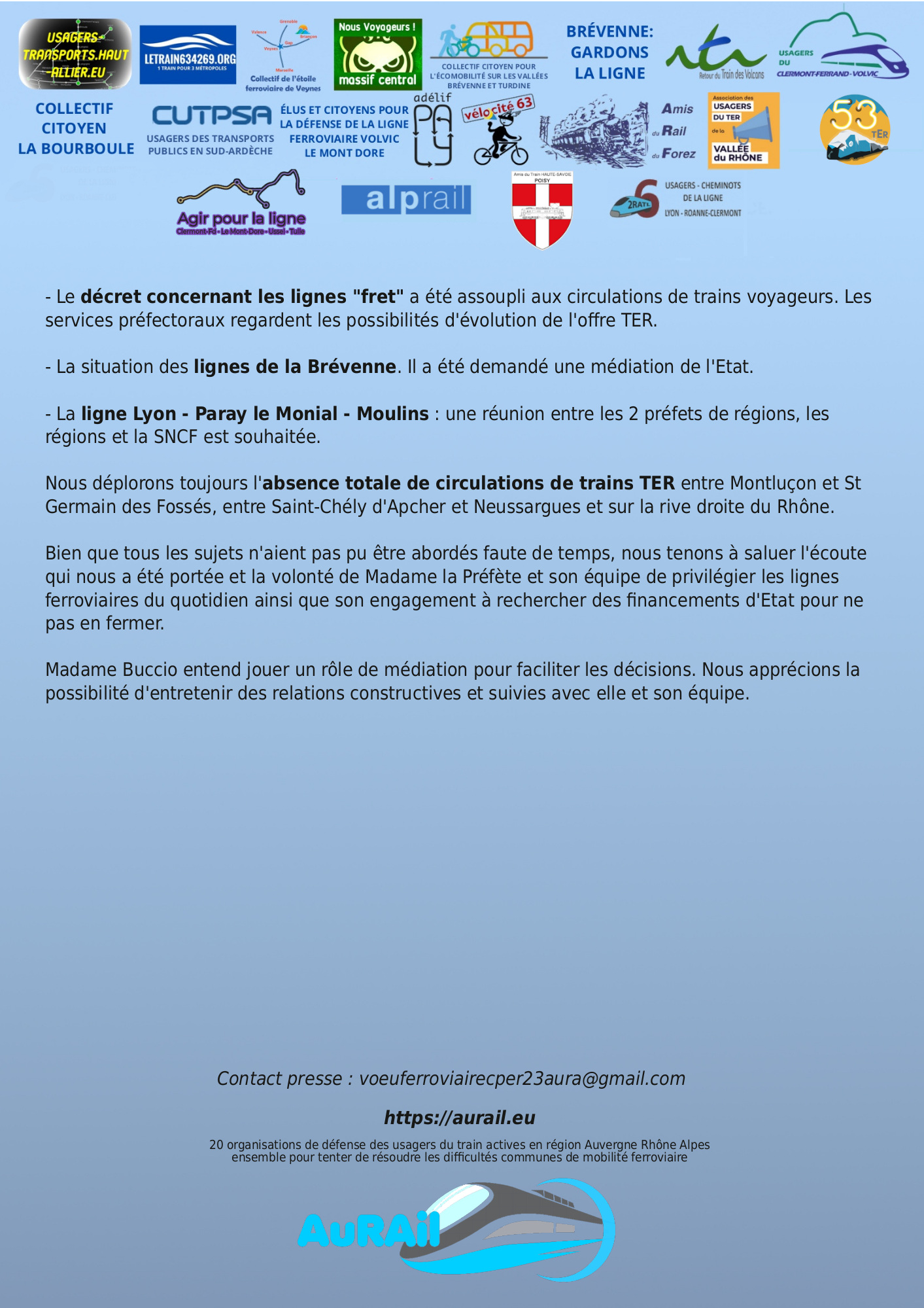 Nous tenons à saluer l’écoute qui nous a été portée et la volonté de Madame la Préfète et son équipe de privilégier les lignes ferroviaires du quotidien ainsi que son engagement à rechercher des financements d’Etat pour ne pas en fermer.