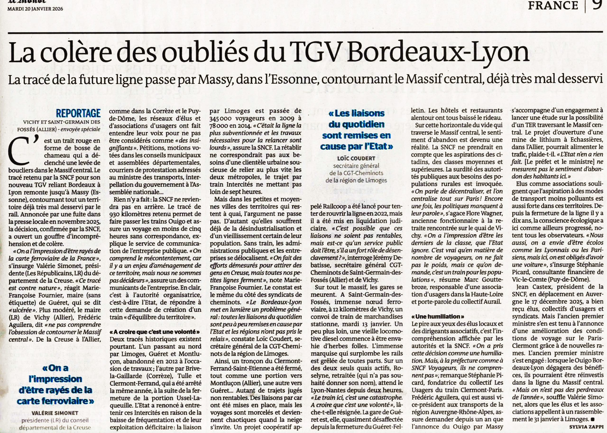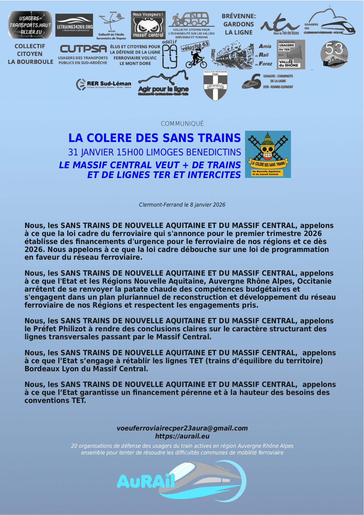 Rassemblement maximal des usagers de Nouvelle Aquitaine, du Limousin, d’Auvergne et du Massif Central le samedi 31 janvier à Limoges, gare des Bénédictins. Le Collectif AuRAil sera évidemment présent pour porter les demandes des citoyens du Massif central.