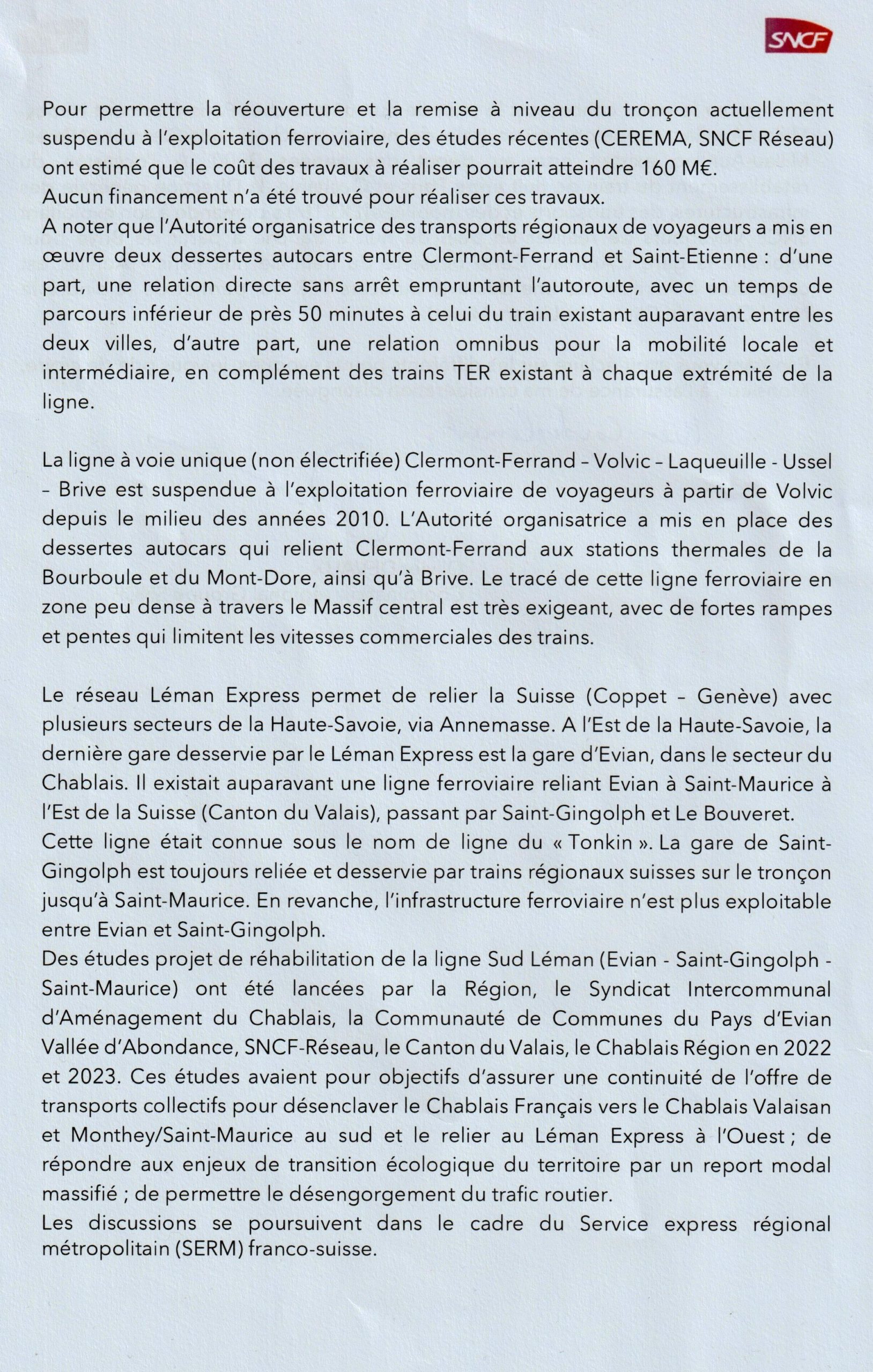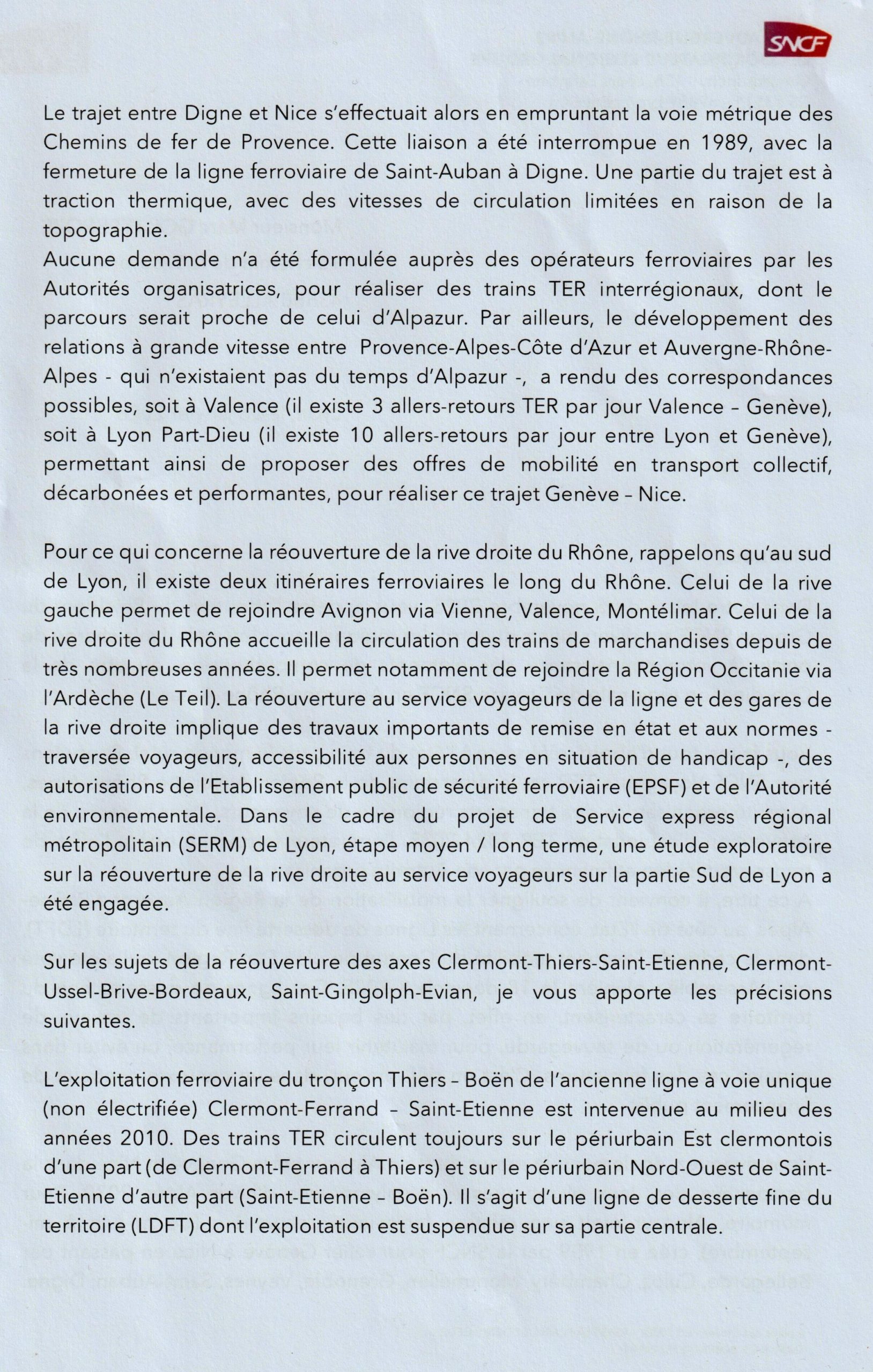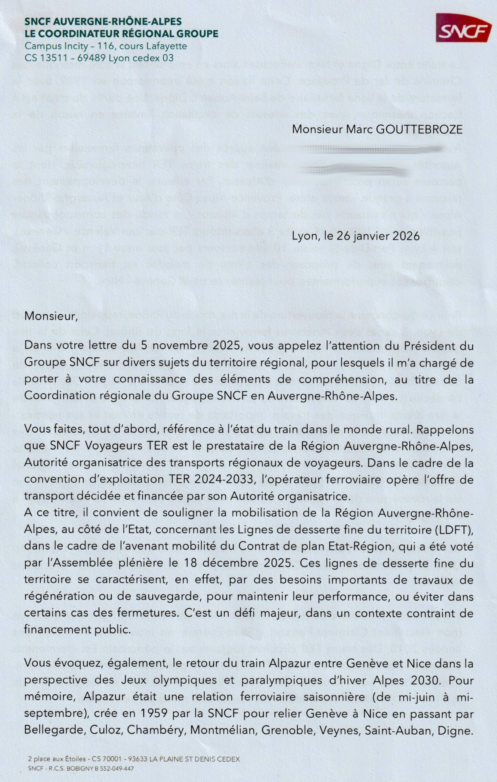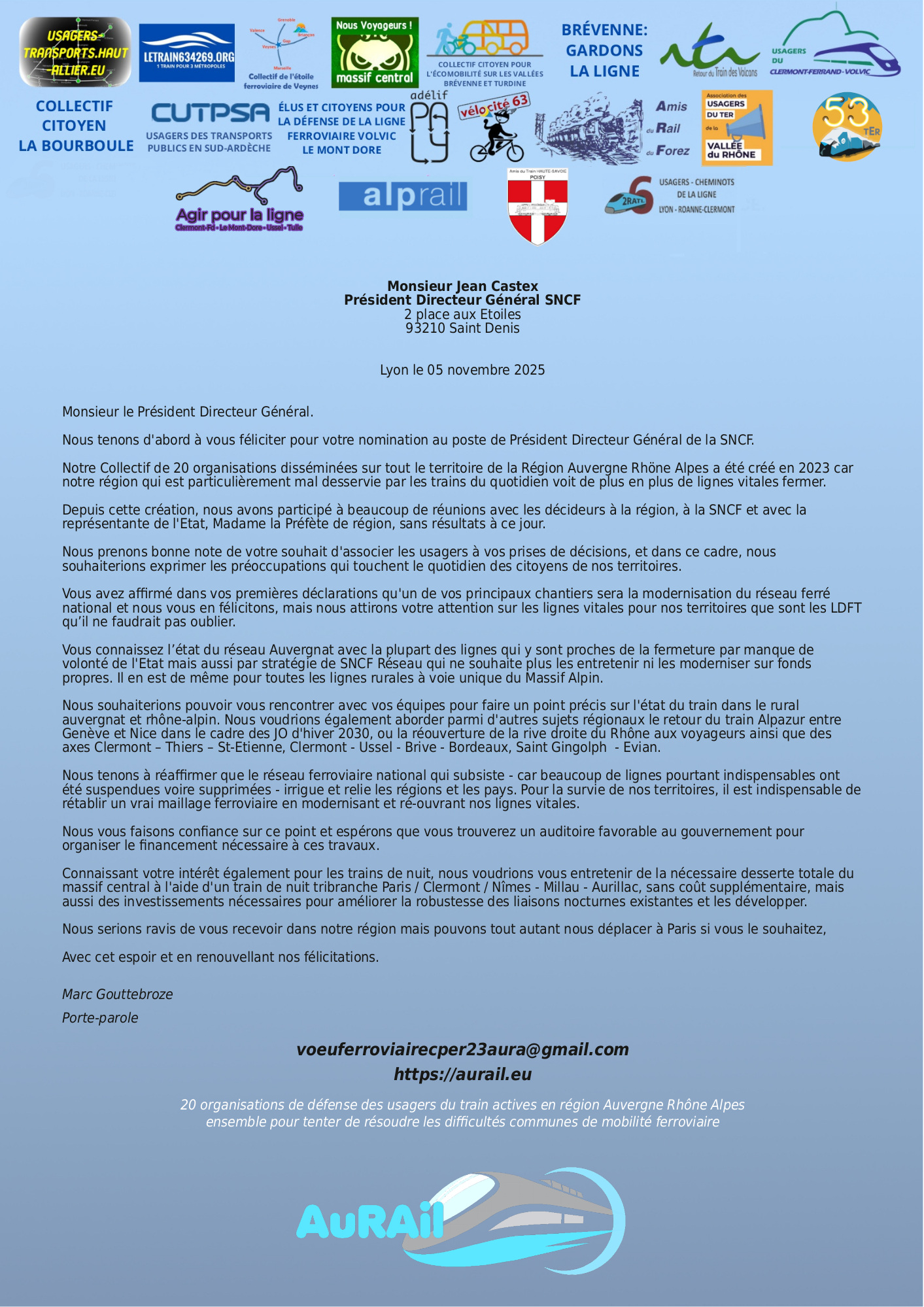Nous avions souhaité le rencontrer au moment de sa nomination pour lui parler des sujets qui nous préoccupent régionalement. Certes nous ne devions pas être les seuls. C’est Olivier Devaux, coordinateur régional SNCF Lyon qui a du s’y coller avec une réponse de 4 pages qui n’apporte pas un souffle d’espoir bien entendu, et qui se contente de dépeindre la situation. Laquelle situation nous est bien connue, merci SNCF AuRA de la rappeler en détail. Nous aurons au moins l’analyse officielle de l’opérateur.