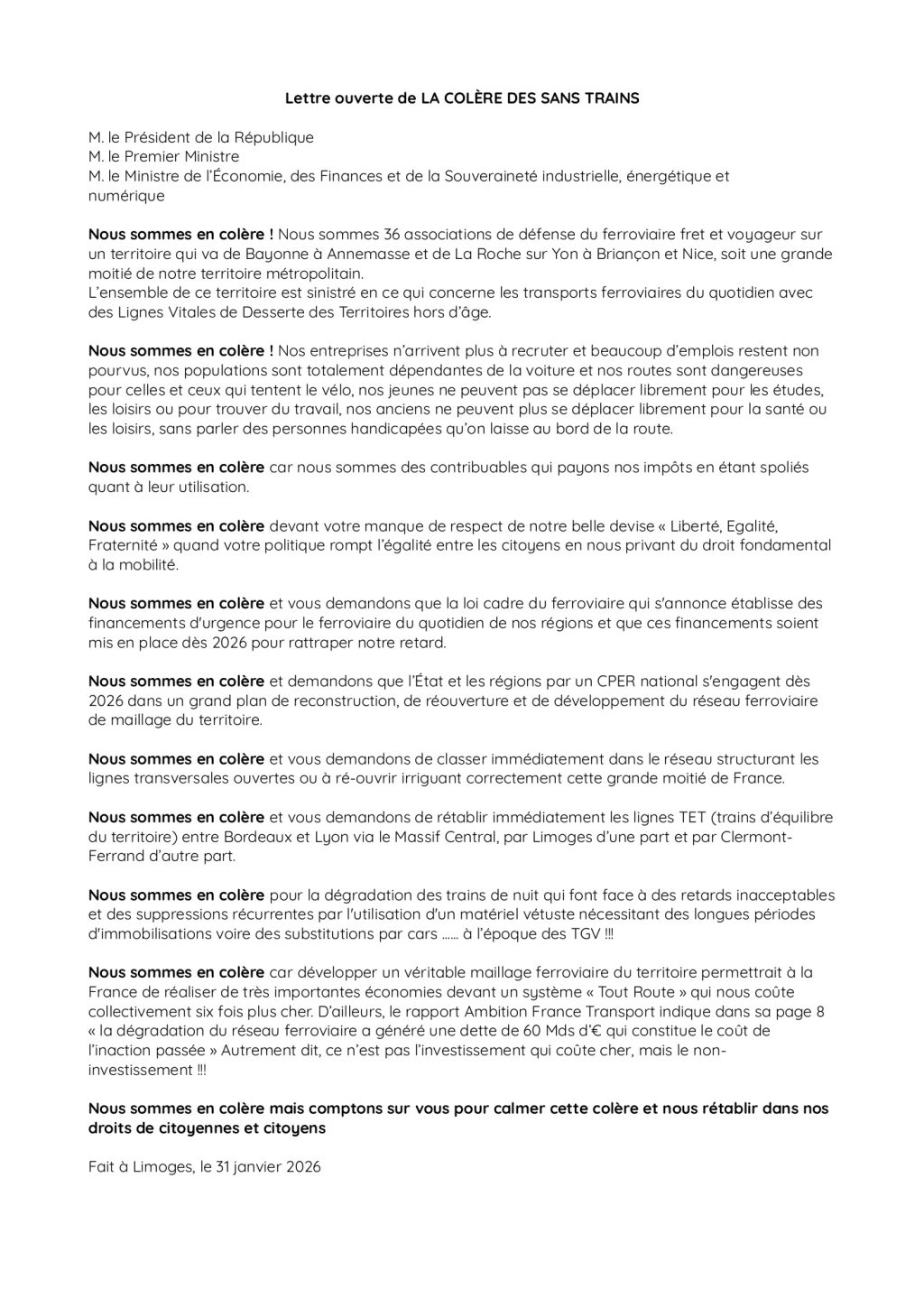 Suite au succès de notre rassemblement à Limoges avec de 800 à 1000 manifestants et un bon impact sur les médias, à la veille de la présentation de la loi cadre des transports au Conseil des Ministres, le courrier au Président de la République, au Premier Ministre et au Ministre de l’Economie des Finance a été envoyé en recommandé. Elle vient d’être diffusée aux médias.